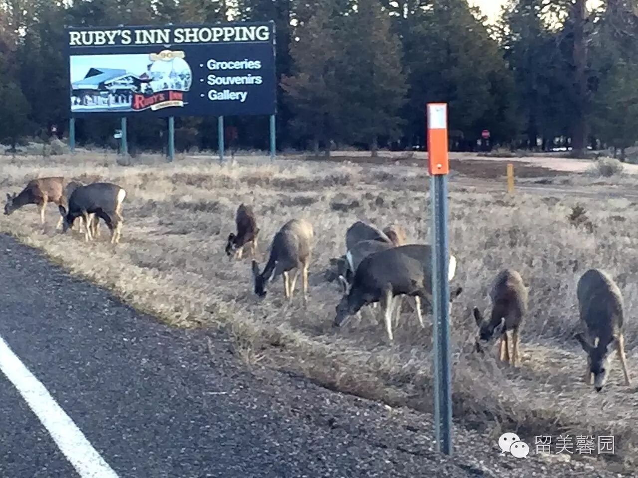 晨曦中,一群骡鹿旁若无人在路旁吃草,过往车辆都停下来,静静地观望。