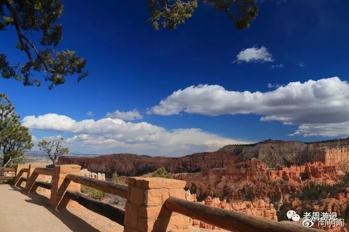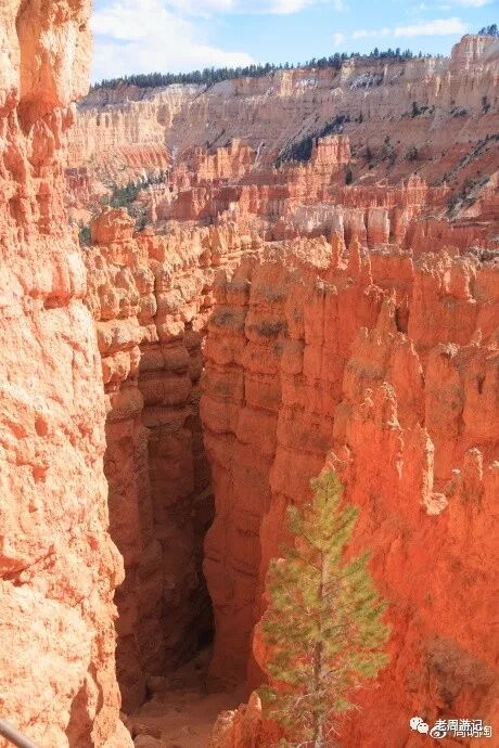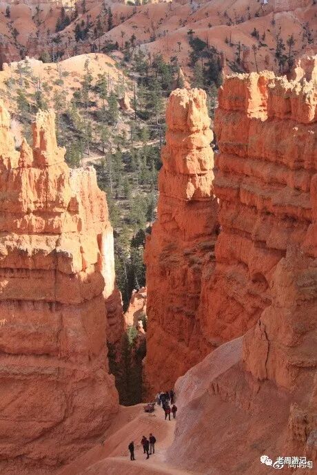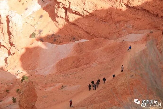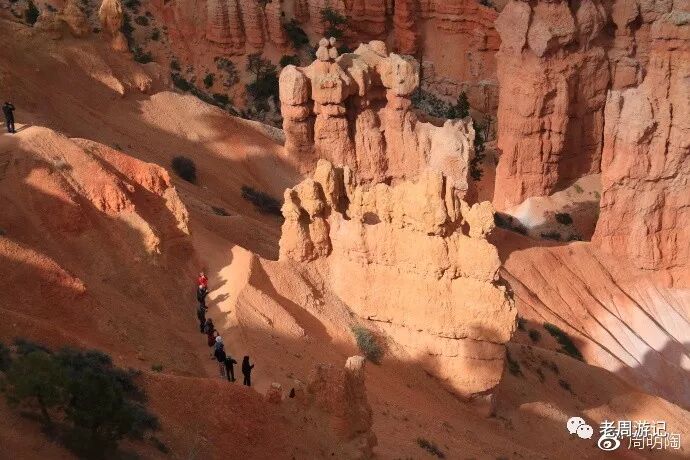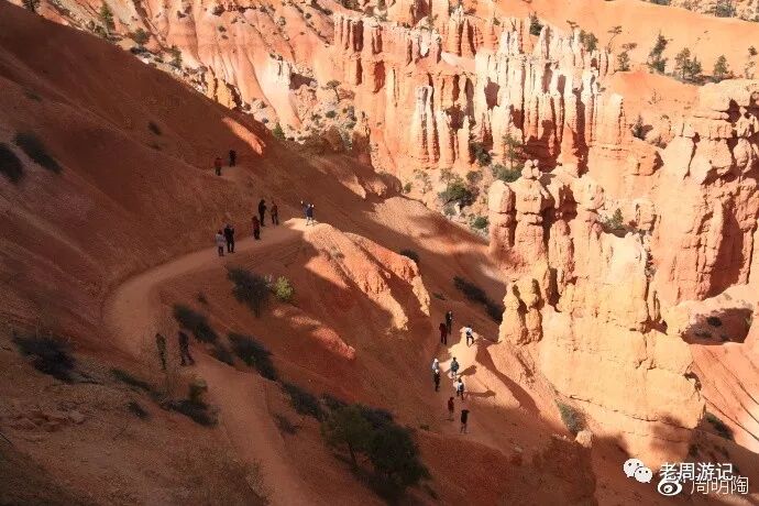 我真的很想沿徒步小径走一圈。在日落点和日出点之间就有一个NAVAJO(纳瓦荷)小径的入口,往返1.3英里,约摸两公里。不算长啊,但一看都是峡谷地原始砂石路,既有坡又会打滑,像我这种老头一个小时可能都回不来。算了,站在风景走廊看看人家徒步过过瘾吧。