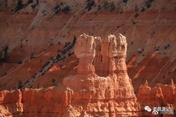 布莱斯峡谷国家公园有一个别名叫露天剧场国家公园,因为峡谷里有个景观区像露天剧场。据说在风景走廊就能看到,而我又恰恰找到了露天剧场的标志牌。沿着标志牌看过去,一遍对照一边看,怎么就没有看出来呢。坐下来休息一下,发现那不就是吗?至于对不对只有天知道。
