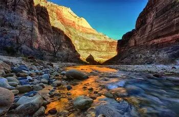 清晨起床观看日出, 悠闲地欣赏缓缓上升的日出美景, 接着在酒店享用美味的早餐, 之后可自由参加乘坐直升机深入峡谷(自费), 在清晨的习习凉风中乘坐游艇饱览科罗拉多河两岸的壮丽风光;接着乘坐西部牛仔马车畅游西峡谷,和观赏精采的西部牛仔枪战, 依依惜别热情的牛仔后,途经拉斯维加斯继续前往秀丽的西锡安公园。游览科罗布的雄伟的赤壁﹑潺潺的溪流﹑傲立的苍松﹑冰河的遗迹﹐令您如置身世外桃源一般, 夜宿飞摩市