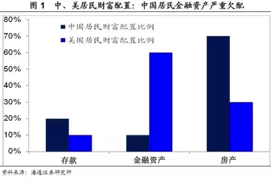 从某种程度讲,一提到金融,我们就会首先想到美国。我们可以对比下中国、美国居民财富配置情况,如下表。