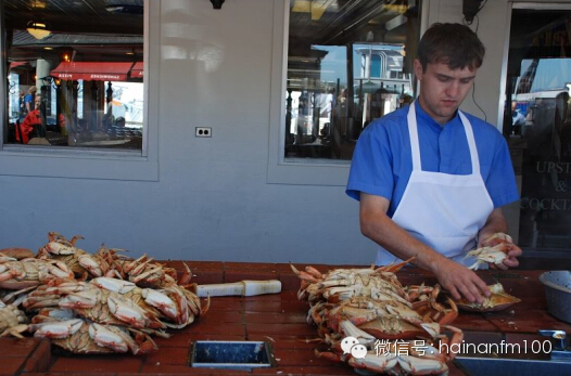 渔人码头的标志是一个画有大螃蟹的圆形广告牌,找到了“大螃蟹”,就到了渔人码头,也就到了旧金山品尝海鲜的首选地点。渔人码头附近沿海盛产鲜美的螃蟹、虾、鲍鱼、枪乌贼、海胆、鲑鱼、鲭鱼和鳕鱼等海产,品尝海鲜的最佳时节是每年11月到次年6月之间。这时候来到渔人码头,人们可以吃到上好的丹金尼斯大海蟹。海鲜烹饪的方法很简单,红烧、椒盐这些会损害海鲜原味的做法都被白灼取代。没有了调味料的掩盖,海鲜的新鲜程度、肥嫩程度以及烹饪时的火候被体现得淋漓尽致,鲜美的程度难以言表。