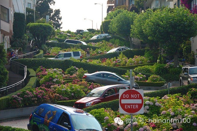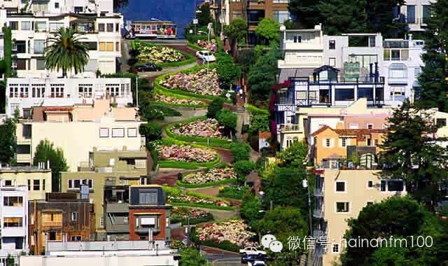 斜街是旧金山的一大特色。从浪巴街到利文街这一段是一个大下坡,市政当局为了防止交通事故,特意修筑花坛,车行至此,只能盘旋而下,时速不得超过5英里,这段街道因此有“世界上最弯曲的街道”之称。来到旧金山,游客大多要来这里考验一下自己的驾驶技术。车道两边的花坛里种满了玫瑰,街两边家家户户也都在门口养花种草,花开时节,远远望去,犹如一幅斜挂着的绒绣,美不胜收,“花街”的美名,因此而来。