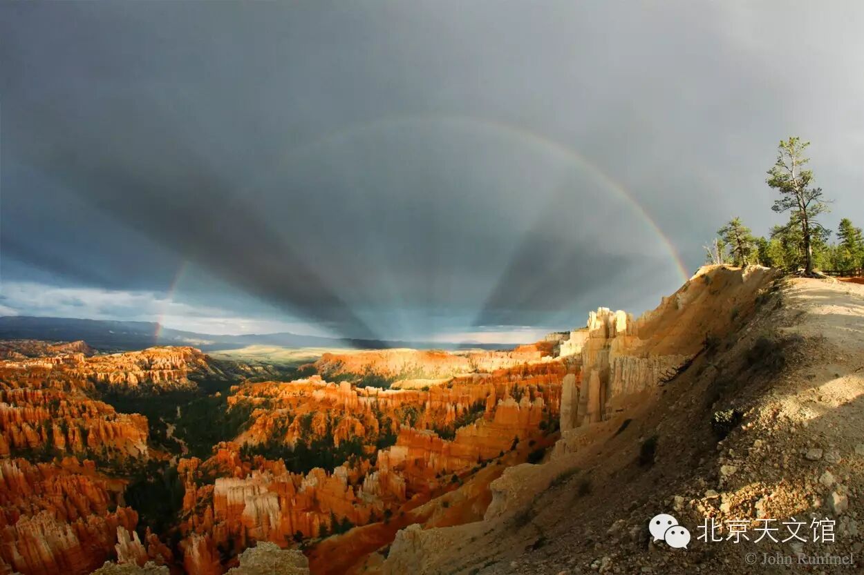 布莱斯峡谷上空发生了什么?在本月初拍摄的一张照片上出现了两种不同的光学效应。而这两种效应都需要太阳位于摄影者的正后方。其中,第一种光学效应是常见的彩虹,它是越过摄影者头顶的落日阳光,被峡谷前缘的雨滴散射所致。如果你仔细观察,甚至可以看到在这道彩虹上方还有另一道彩虹。然而极为罕见又令人惊奇的是峡谷上方地平线所散发出的光芒。它们也被称为反云隙光,是穿透云缝越过天空的阳光,最后汇聚在和太阳180度反向的一点上。在几何学上,这个对日点必须和彩虹弧的中心完美重叠。位于美国犹他州的布莱斯峡谷,以拥有独特的古老耸立沉积岩柱而著称。