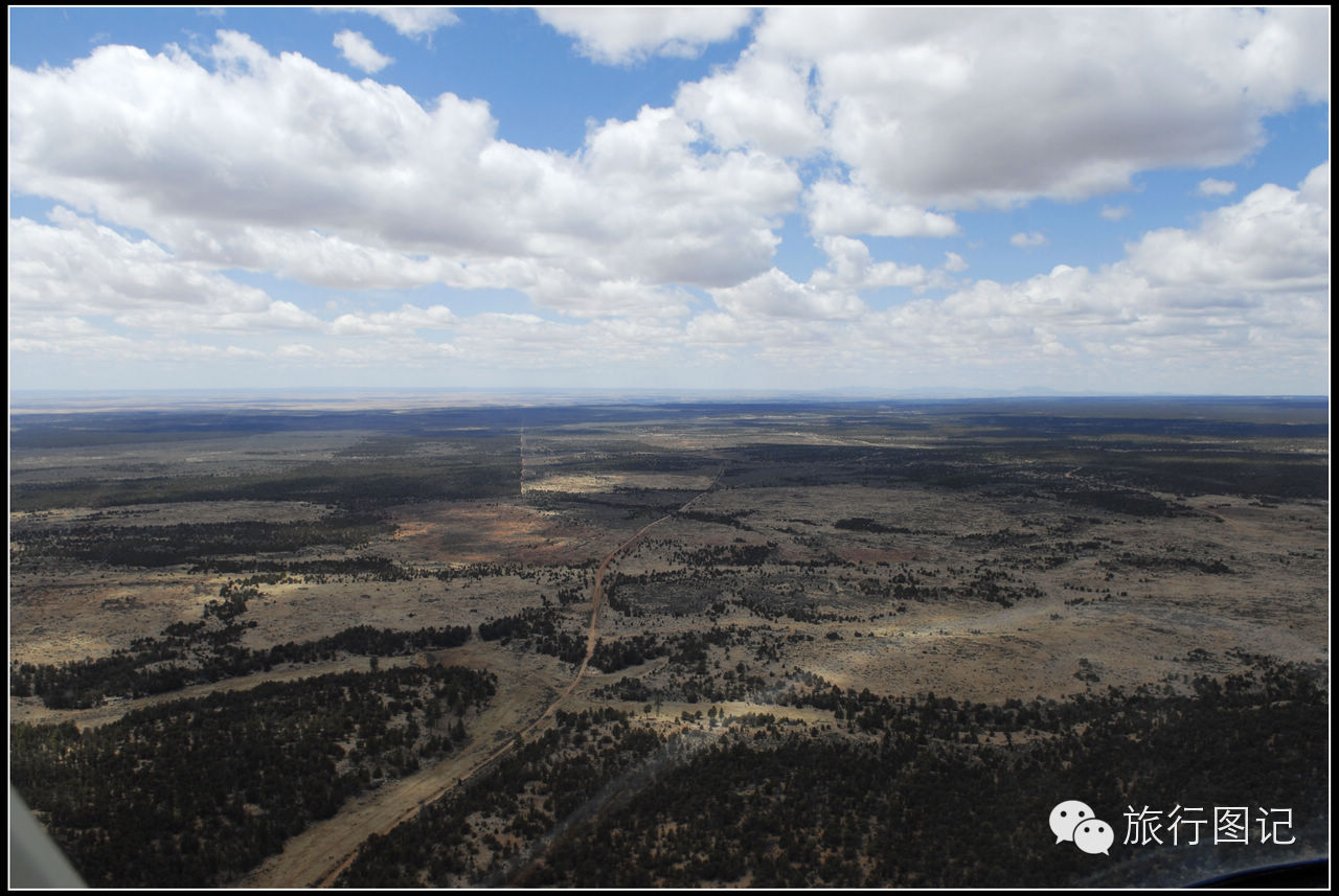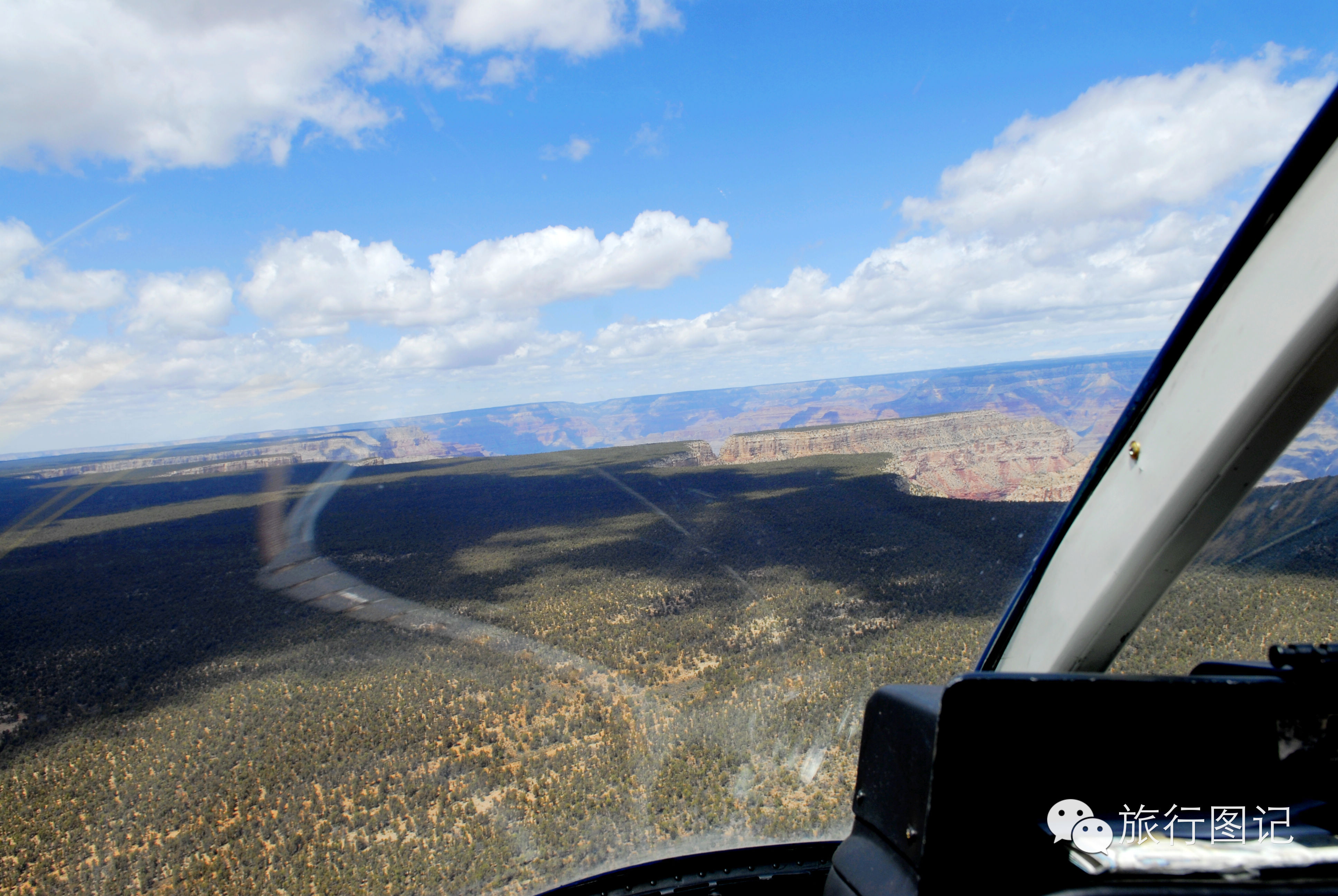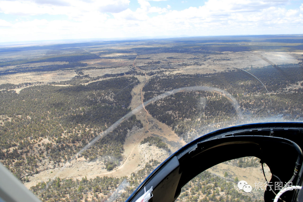 第一次乘直升飞机,感觉有一点点抖,升空大概有二百米左右,直升机向大峡谷一带飞去。透过前窗和脚下的玻璃窗,可以看到,茫茫荒野的高原地貌,人烟稀少,据说,这里是印第安土著部落管辖的地区。