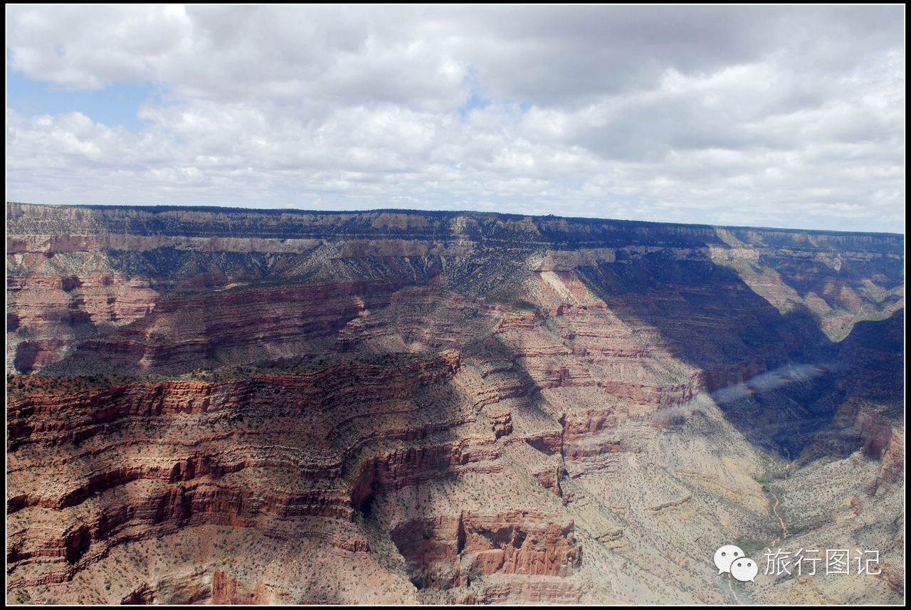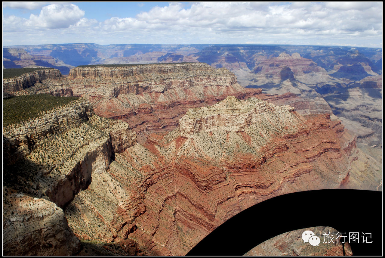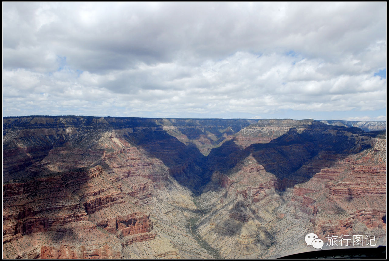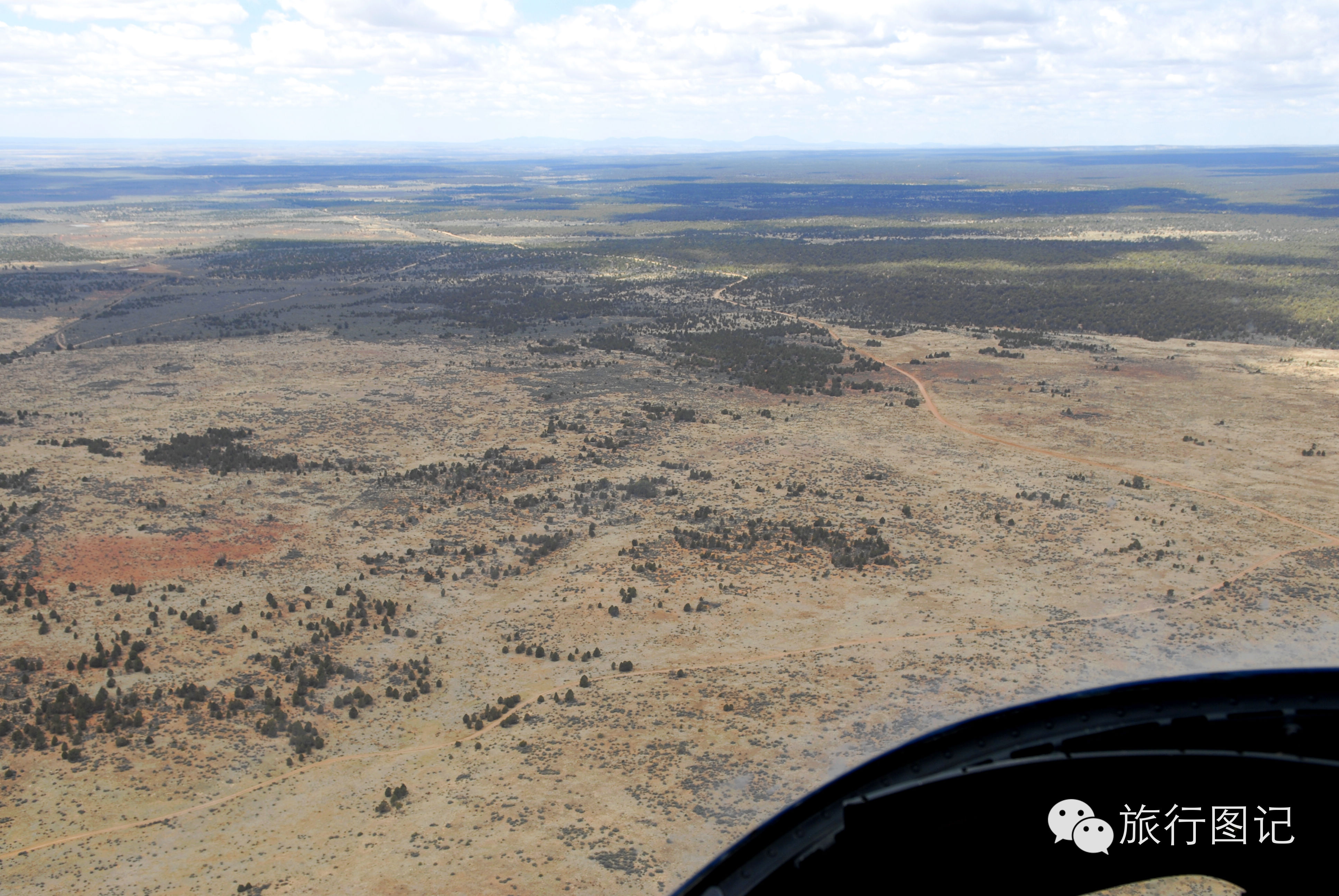 第一次乘直升飞机,感觉有一点点抖,升空大概有二百米左右,直升机向大峡谷一带飞去。透过前窗和脚下的玻璃窗,可以看到,茫茫荒野的高原地貌,人烟稀少,据说,这里是印第安土著部落管辖的地区。