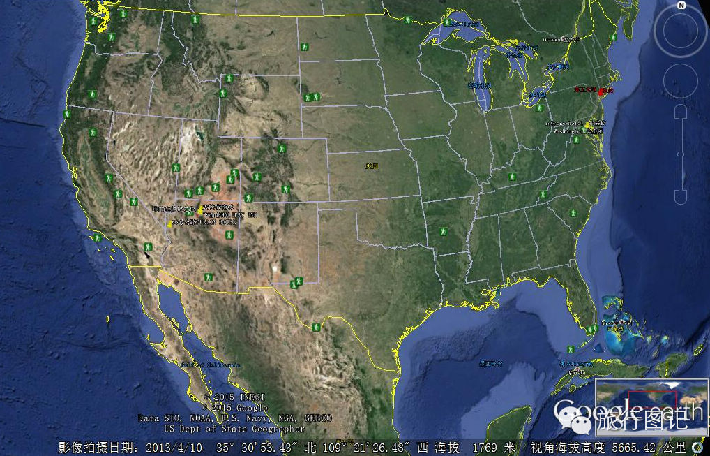美国卫星图上大峡谷的位置,点击大图可见,图中中线左侧标记处即为这次旅行的目的地-科罗拉多大峡谷南缘一带。