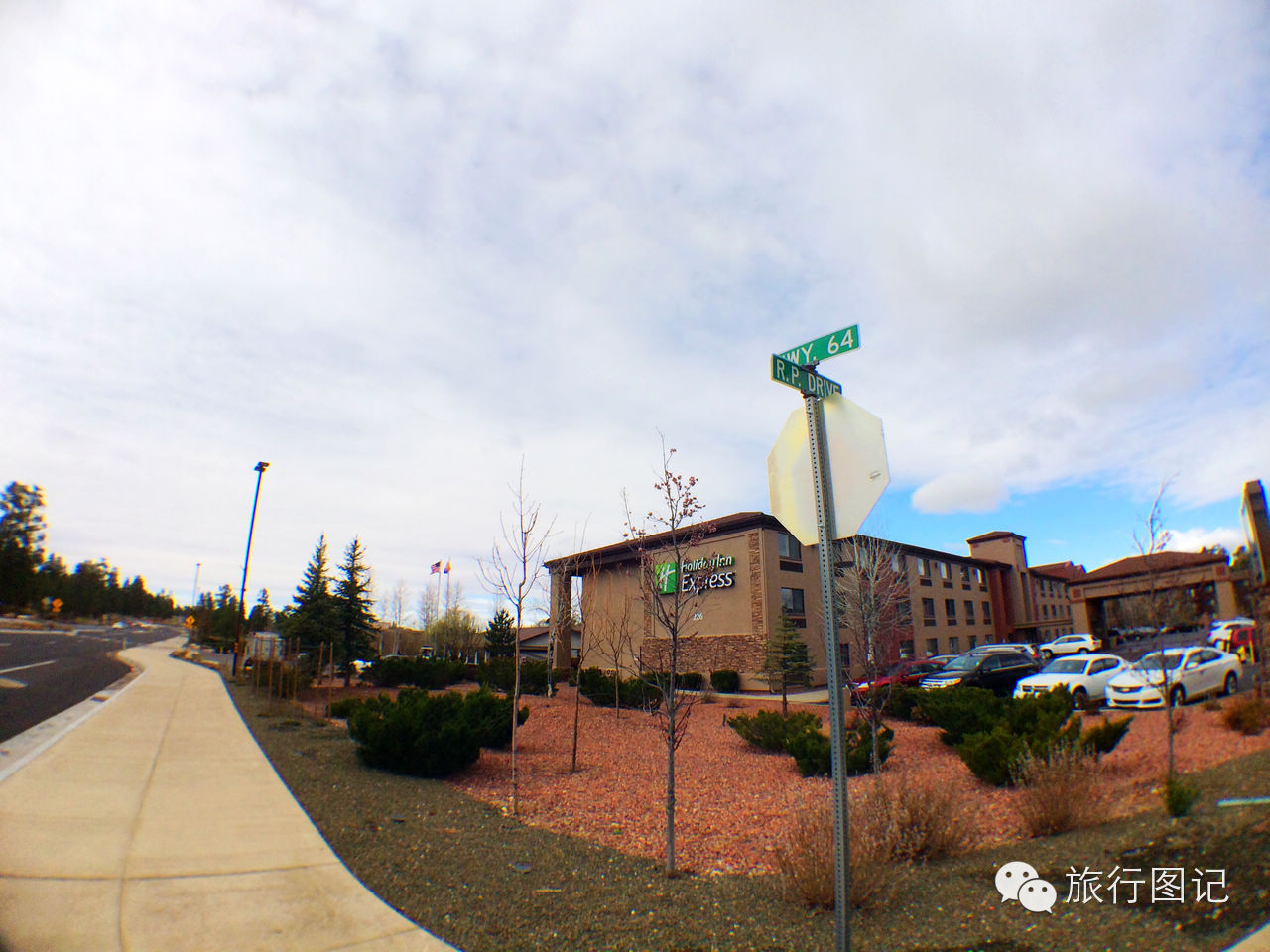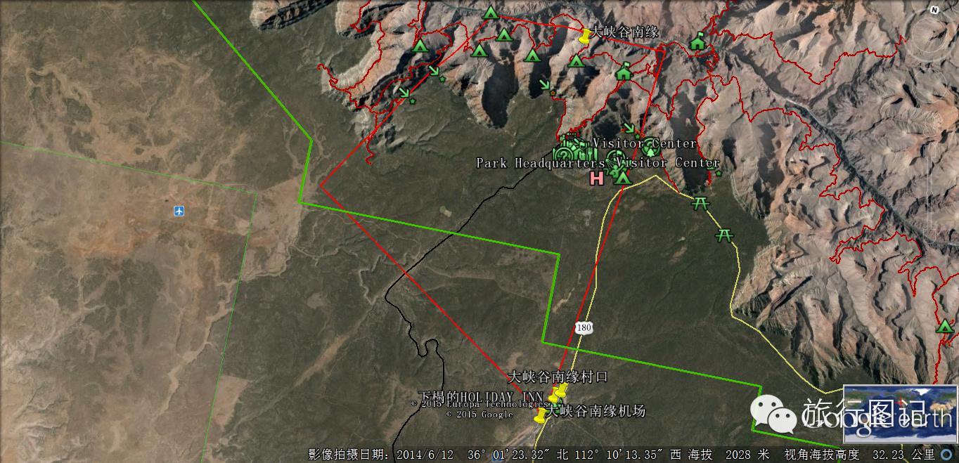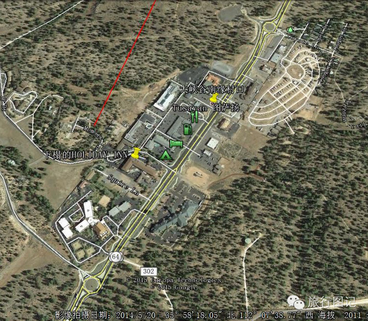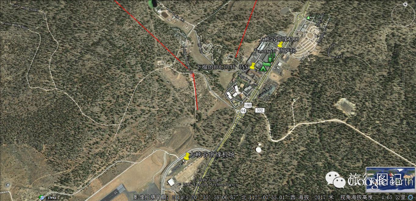 大峡谷南缘入口处位于一个叫图萨扬的村子,村子不大,建有一些度假酒店,图中标记处即为俺下榻的HOLIDAY INN酒店。图中右上方的大停车场是自驾旅行车休息营地。