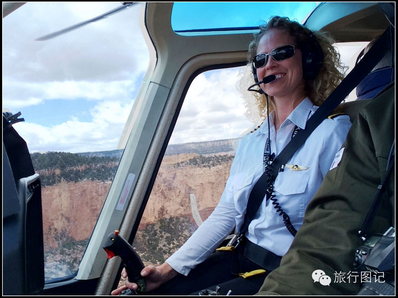 飞行途中,我们都戴着大耳机,原来机场方面能为所有乘客提供各种外语导游解说,但一般一次航班最多只能做两个语种的乘客,我这一班除了我可以听中文解说之外,机仓里的德国人全家应该听得是德语解说,就这一点,你不能不佩服游览服务之周到。美女飞行员也十分NICE,途中看到我在拍照,不时还给予配合,美!