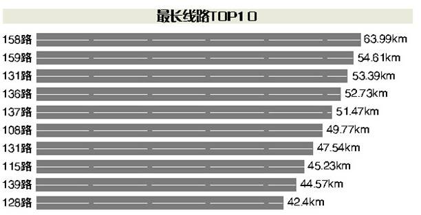 在十条最长公交线路中,你有没有发现,这些线路均是“1”字头的长途公交,平均长度为50公里以上,不愧为“长途”公交。你是不是天天要坐其中一辆上呢?