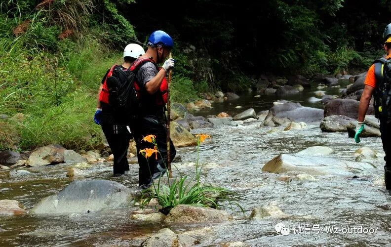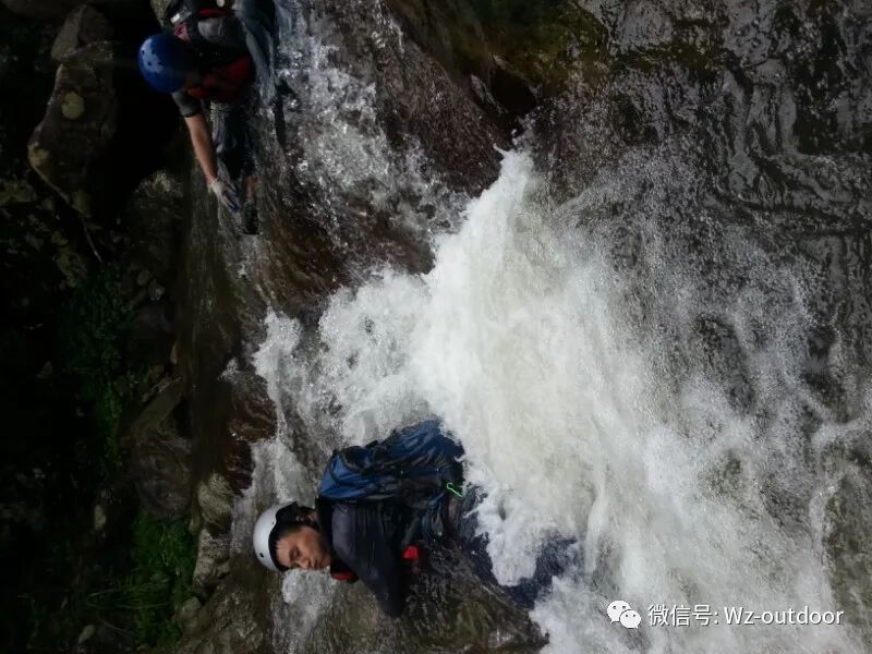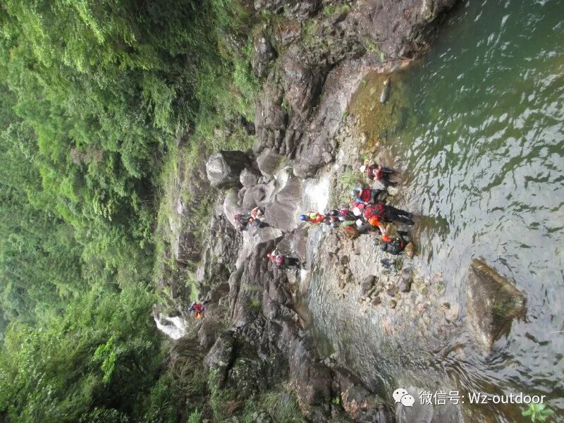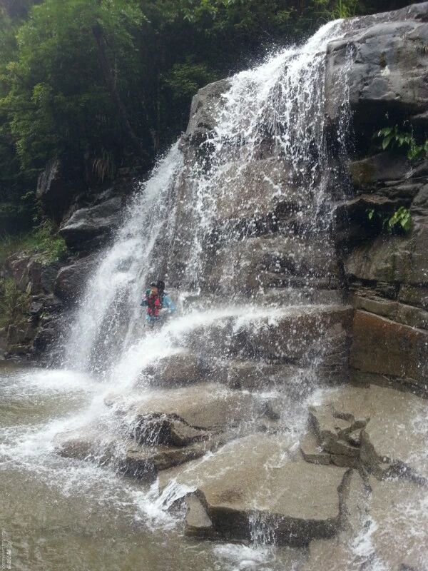 从大坝中间陡峭的石径下行到峡谷入口,两侧山形崎岖险峻,峰岭夹峙,一股属于峡谷的味道迎面而来,树木的清香味,落叶腐烂的异味以及粘稠潮湿溪水清冽的味道。。。一行人在泥泞的小路默默前行,不一会儿一条十来米宽的水塘,阻挡了前行的路,也预示了今天之行与水的缘分,全方位的接触,全身心的投入。华山一条路只能游泳过去,对于不会游泳的我,也就寓意着今天的行程的艰辛。