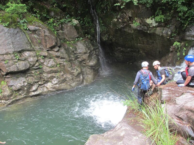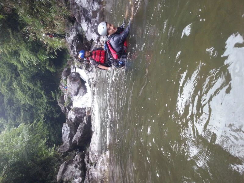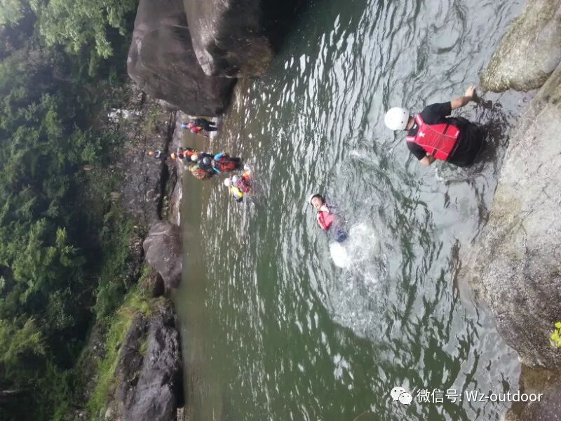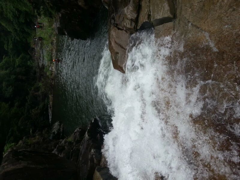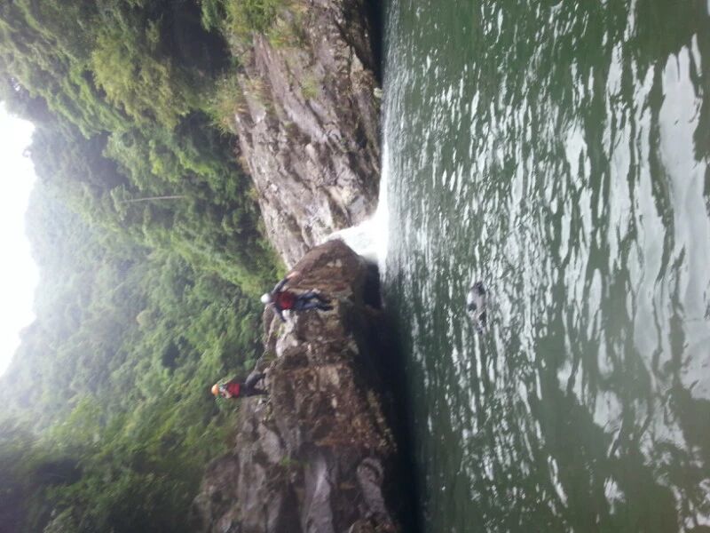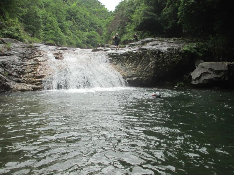 峭壁跳水深潭游泳,向来只能从网络或媒体上看到,对于不会游泳的我,是多么的遥不可及的事情。但今天十八岁的姑娘头一回,我也跳水了,不是我自己跳的,是我请求领队推我下水的,实在是没这个胆。