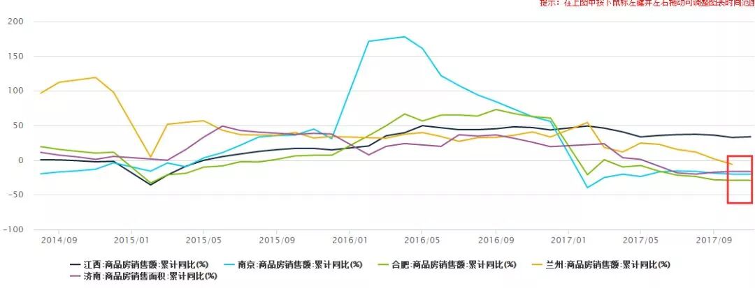 上面这张图列举了江西省、南京市、合肥市、兰州市、济南市的商品房销售金额同比变化。
