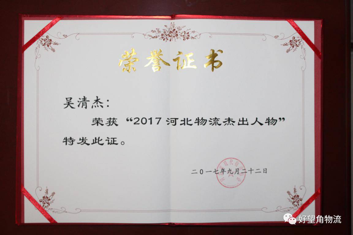 会议通报了全省物流行业中的优秀集体及先进个人的评选情况,作为河北省现代物流协会副会长单位,我公司再次获评“2017年度河北省物流企业50强”及“物流统计工作先进单位”,公司董事长吴清杰被评为“2017年河北物流杰出人物”,并颁发了获奖证书。