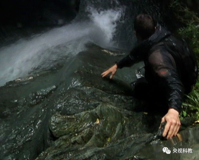 岩石上布满湿滑的苔藓,贝爷想要继续前进,唯一的办法就是跳水!在野外环境跳水可是十分讲究的!如果水太浅,就有摔断腿的危险。那么什么水能跳,什么水不能跳?如何辨别水深水浅?我们的贝爷可是自有妙招,其中的奥秘就是看瀑布形成的水花,如果水花的范围很小,就是水深的征兆,这样的水就可以放心跳!