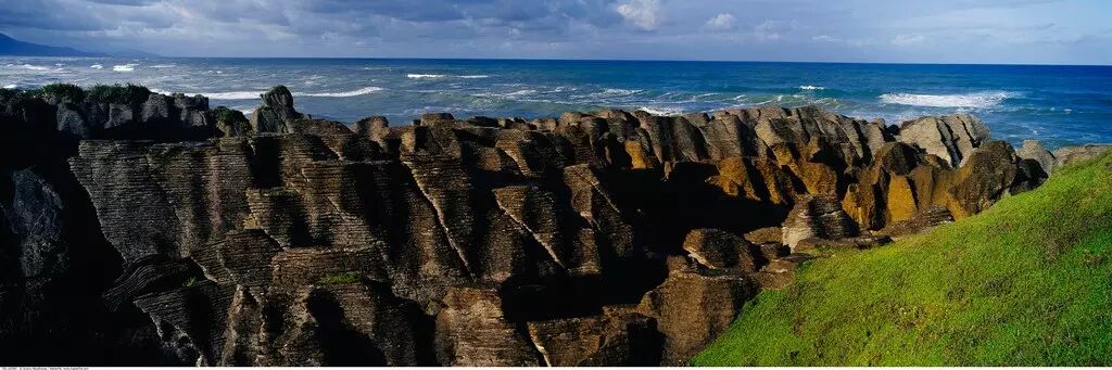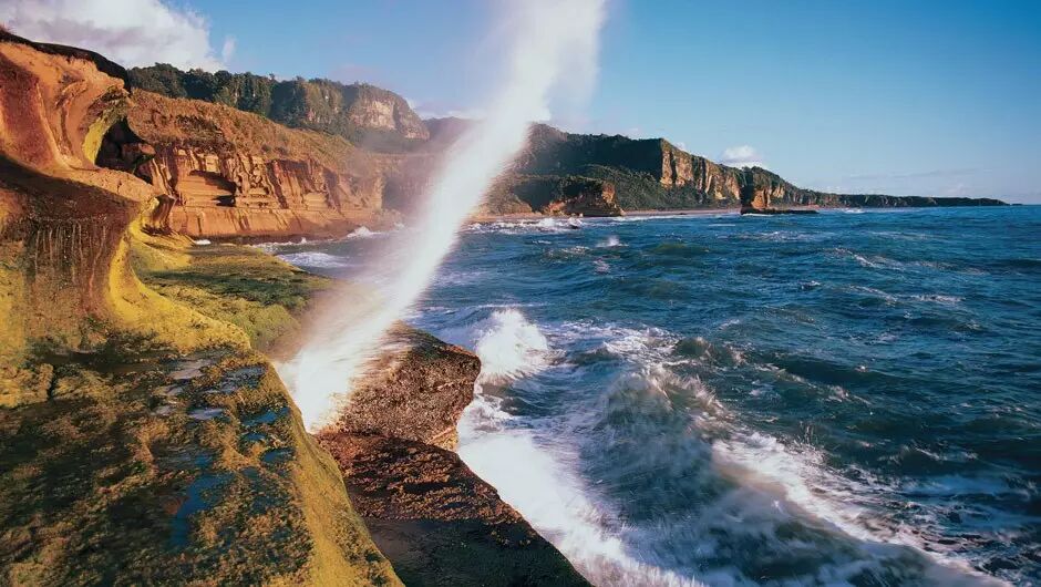 海边的岩石经过千百万年的风化侵蚀,形如一片片的薄饼。汹涌的海浪还在继续冲刷岩石,海浪还会从中空的石洞中喷起数米高的水柱或形成瀑布般景观,很是壮观!