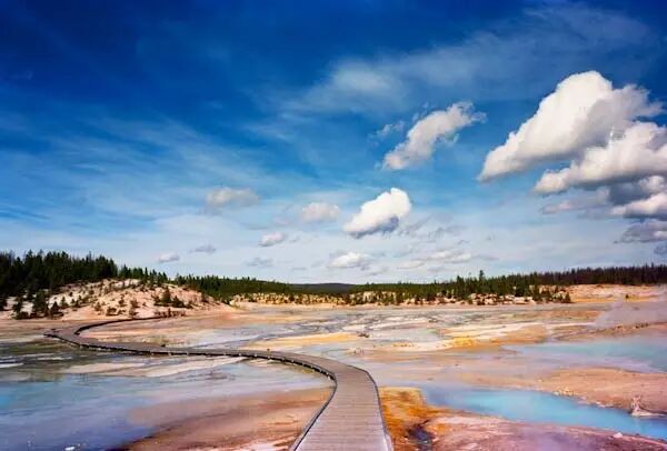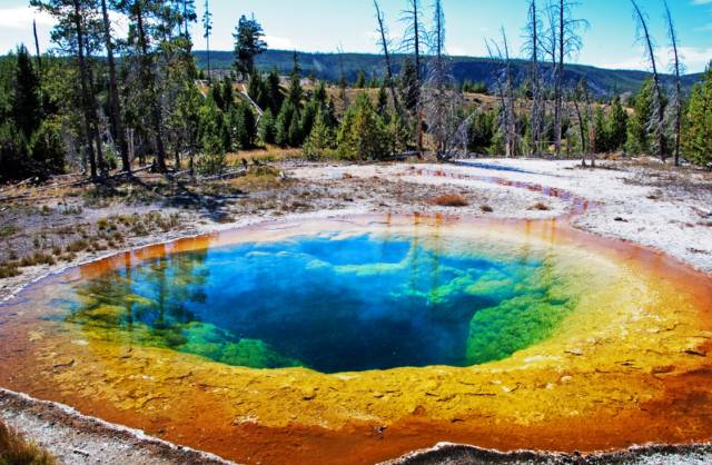 大棱镜温泉也被称为大彩虹温泉,是目前美国最大、世界第三大的温泉。橙色、红色、黄色,每一次去你都能被大棱镜的多变、壮观所震惊。其实大棱镜温泉之所以可以变幻出如此多颜色,是因为它的泉水中富含矿物质的水体中生活着藻类和含色素的细菌等微生物。怪不得人们戏称:上帝打翻了调色盘,把最美的色彩泼洒到了这里。