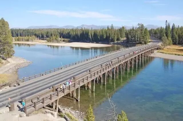 钓鱼桥横跨黄石河,是黄石湖的出口,晴空下水波涟漪。每年6、7月在通往钓鱼桥的路上,可以观看野生鳟鱼在Le Hardys Rapids中跳跃,逆流产卵。注意,钓鱼桥并不能钓鱼,倒是一个观鱼的好地方。