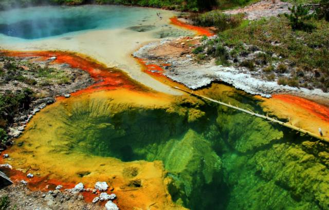 城市君觉得,牵牛花池是黄石公园中当之无愧的最漂亮的热泉。它的温度相较于其他温泉都低,所以可以繁衍出丰富的藻类,让色彩多变而鲜艳。牵牛花池的颜色会随着水温的变化而不同,当水温在85℃时,泉内藻类为白色;82℃时为肉红色;74℃时浅黄色;68℃时为黄绿色。