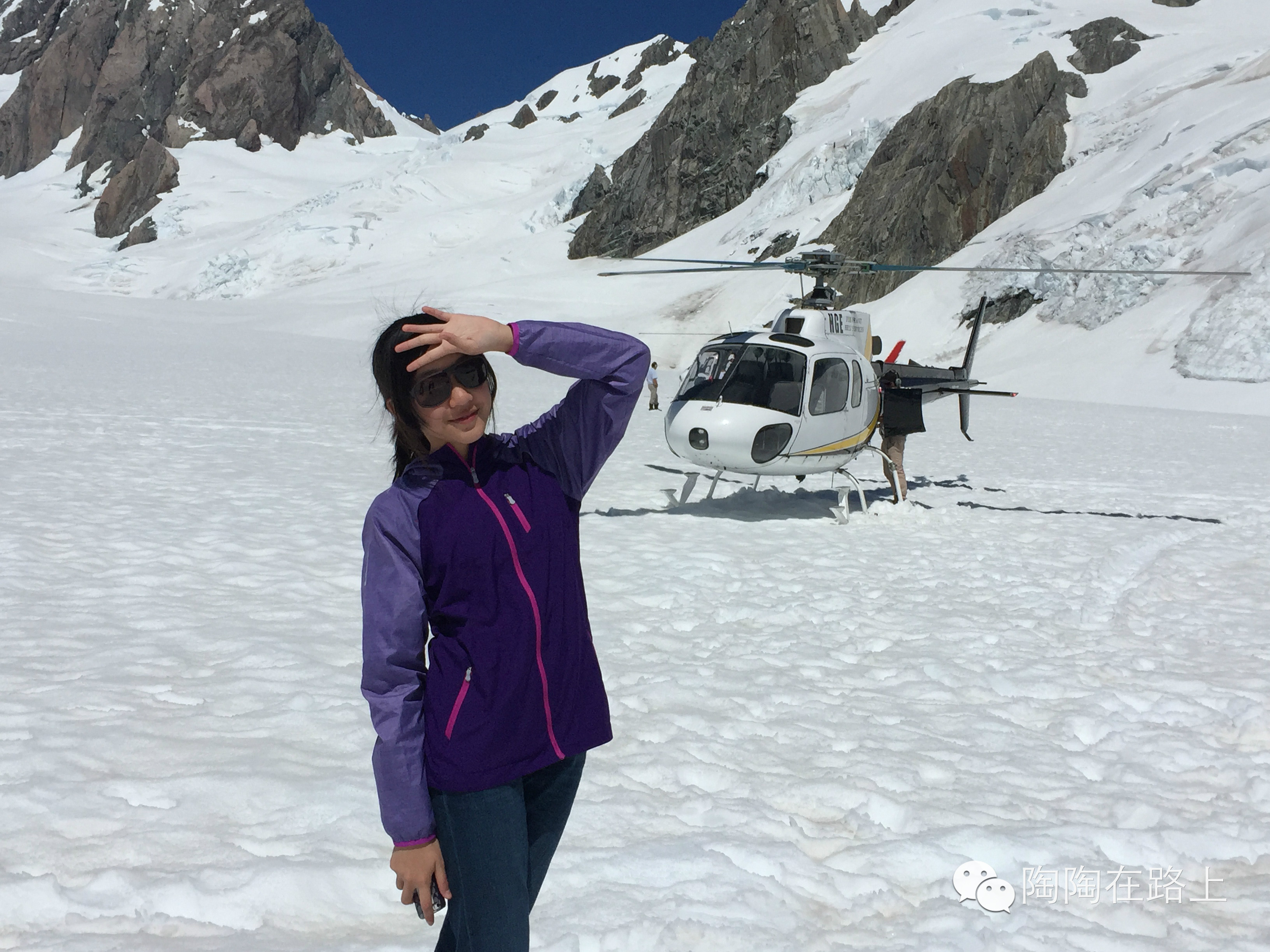 40分钟的直升机穿越冰川雪山,期间降落在约瑟夫冰川上拍照。冰川上空的风景真心美,一下子把几天前峡湾的飞行体验比了下去。