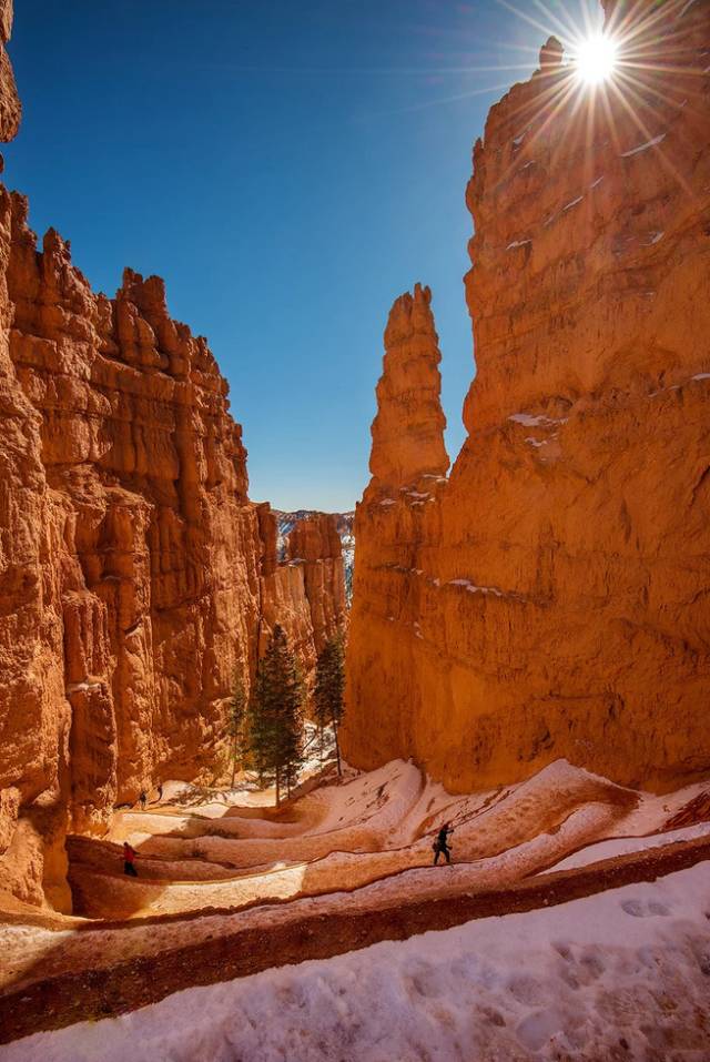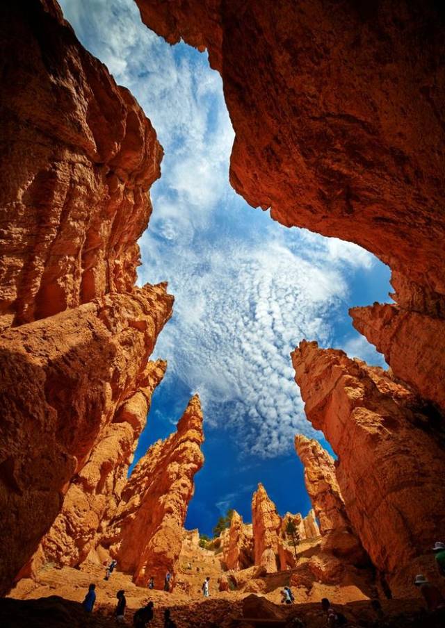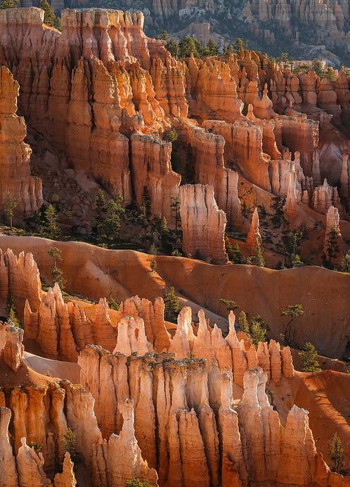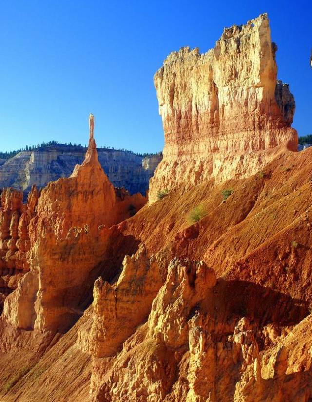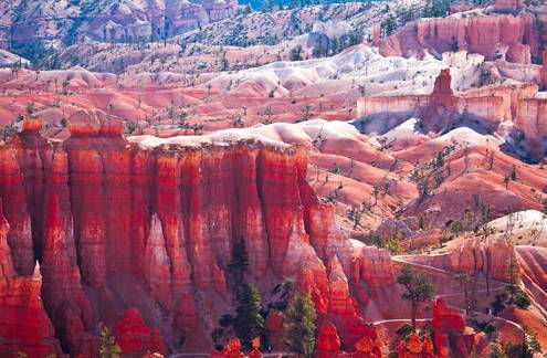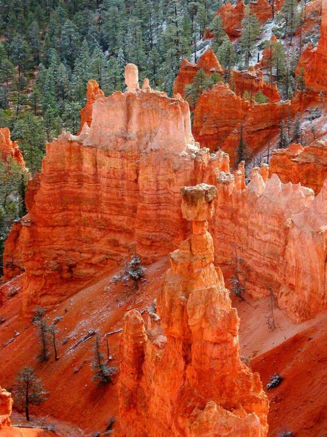 在布莱斯峡谷身上完美的体现了造物主的能力。其独特的地理结构称为岩柱,是由风、河水与冰侵蚀和湖床的沉积岩组成。峡谷之中的红色、橙色与白色的岩石形成了奇特的自然景观,因此其被誉为天然石俑的殿堂。