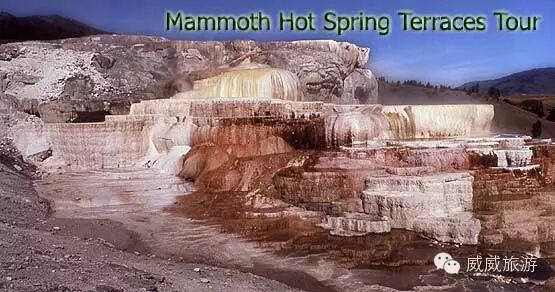 猛犸温泉 (Mammoth Hot Spring)是个特别的地方。虽然温泉是黄石公园最常见的景观, 此地的温泉却和黄石中其他的温泉有很大的不同。不似一个个静汨的深池,它的美是在静中掺合著三分动态的。布满山头的温泉水, 从层层的台地上静静的流过,似乎就是那么的云淡风轻,什么也不带走,什么也不留下,却不知凡走过的必留下痕迹。 除了水火交织成的独特,猛犸温泉的美还加上了石灰岩的因素,石灰质的溶解和再沉积,造就了这里独特的景致, 每天流过的水和矿物,一点一滴的改变着此地的风貌。