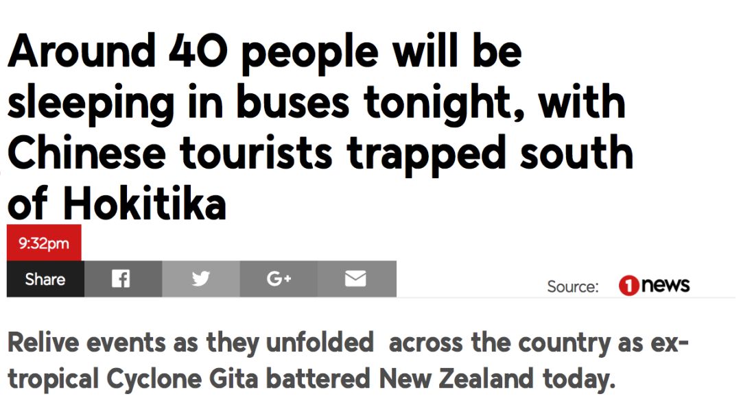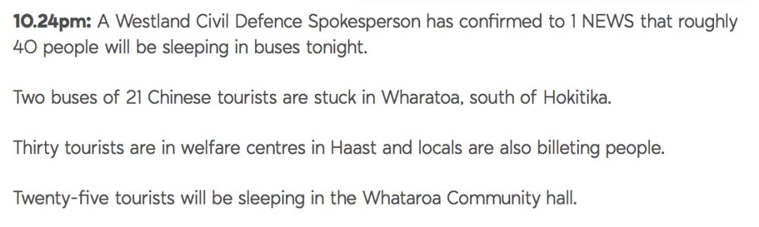 大约21名中国游客被困Hokitika南部地区,被紧急安排睡在当地的Whataroa Community Hall里。Haast救助中心昨晚也安排了30名游客的食宿。