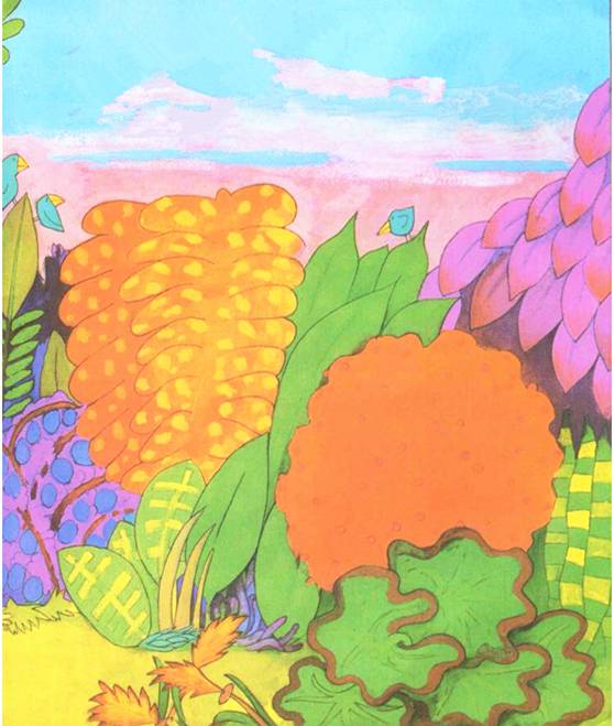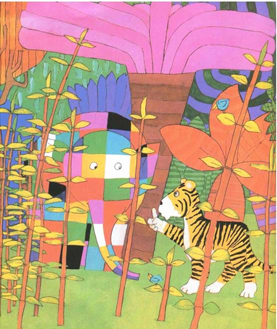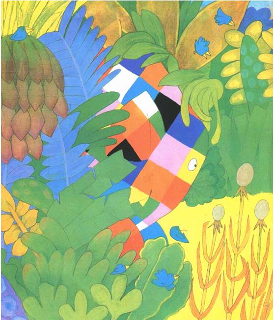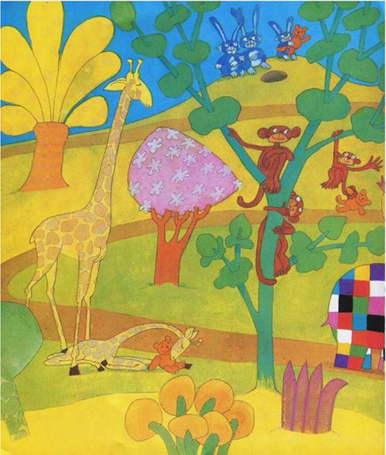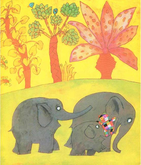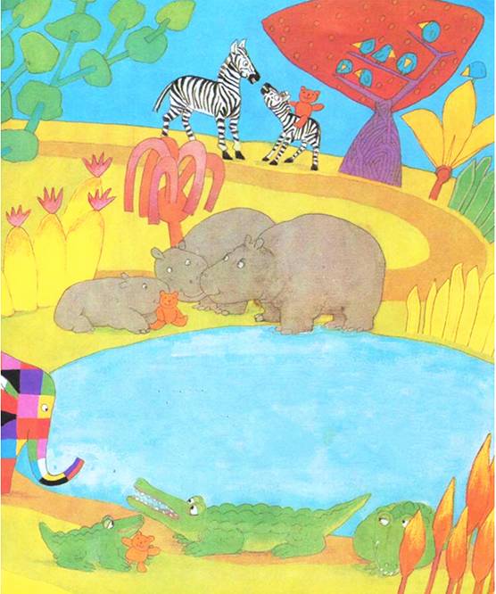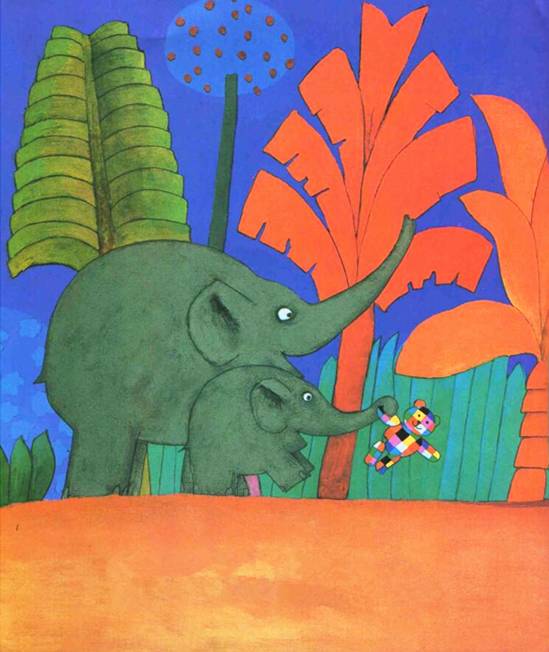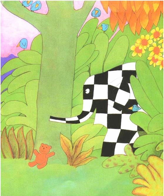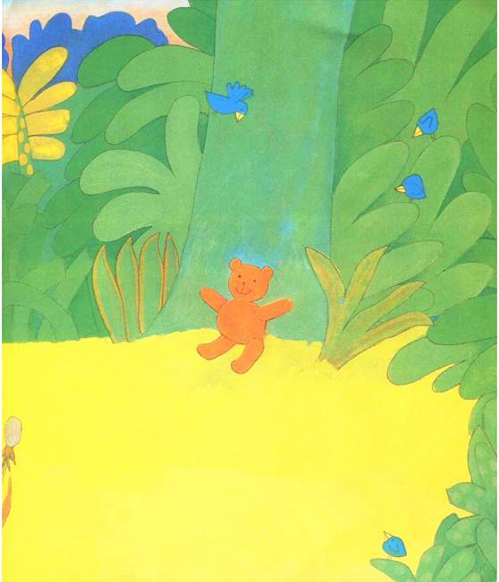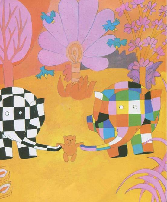 艾玛拨开树丛,看到了一只绒毛熊,是它在叫。“谢谢你帮帮我,”绒毛熊说,“我迷路了。我要找象宝宝。”
