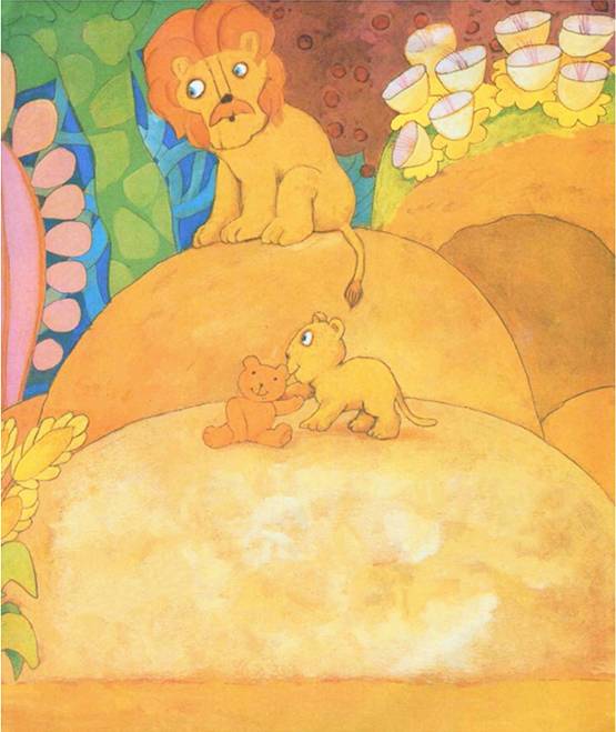 “哎呀,天啊,”狮子说,“狮子宝宝要是弄丢了他的绒毛熊,他会伤心死的。要是我找到了,我会告诉你的。说不定老虎见过它。”