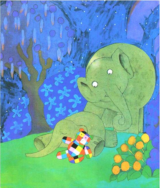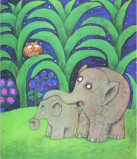 “他睡不着,”象宝宝的妈妈说,“他要他的玩具毛绒熊。他带着毛绒熊跟我们去野餐,不知把它弄丢在哪里了。”