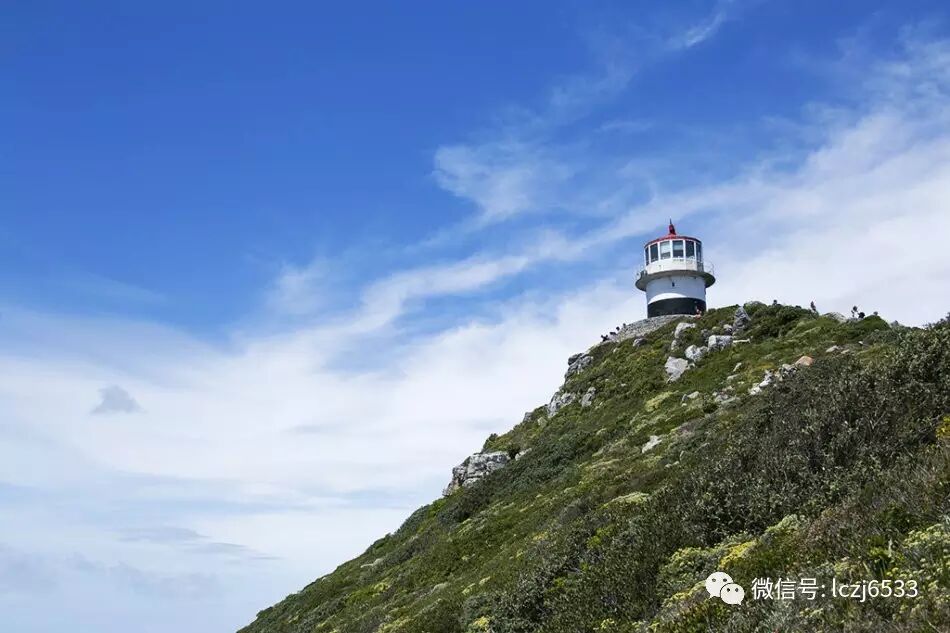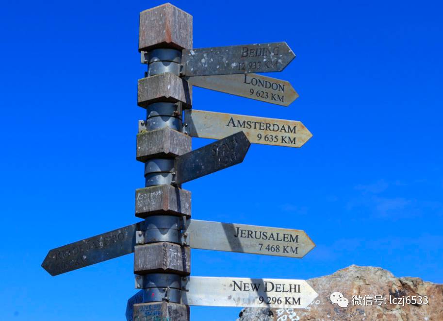 在好望角的一侧,矗立着一个灯塔,颇具历史,这个白色灯塔不仅是一个方向坐标,同时在他的告示牌上还清楚地写着世界上十个著名城市距离灯塔的长度,如北京12933千米。