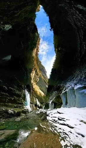 一线瀑:高50米,宽2米,象条银线自天而下。