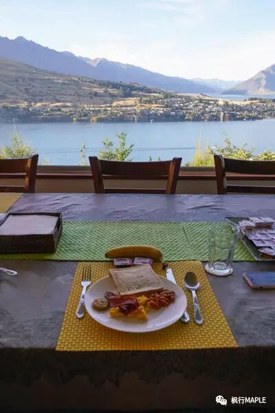 早餐所在的位置通过大窗户看到瓦卡蒂普湖,非常美。早餐简单但品种丰富,有水果、炒蛋、面包、酸奶、肉肠、培根和番茄炖豆,英国style浓郁。