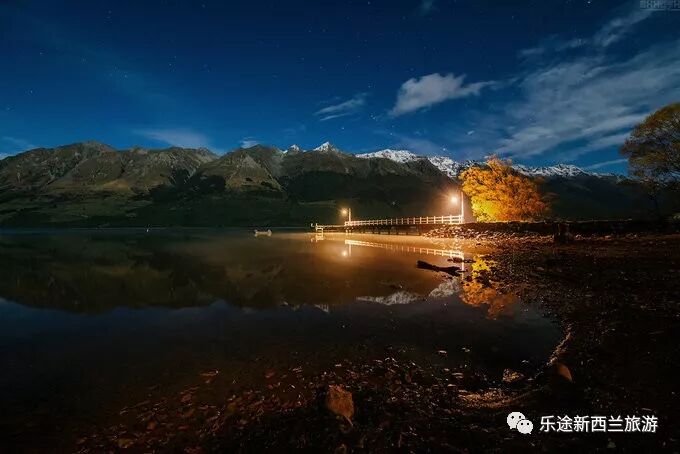 格林诺奇是皇后镇以北的小镇,此处作为指环王的取景地而闻名。镇子本身规模很小,景点也只有一处,格林诺奇的湖边栈道。夜晚时刻站在栈道的镜头眺望远处的雪山,皎洁的月光照亮山头,平静的湖面飘起一层薄雾,用相机记录下了这一美妙的时刻。