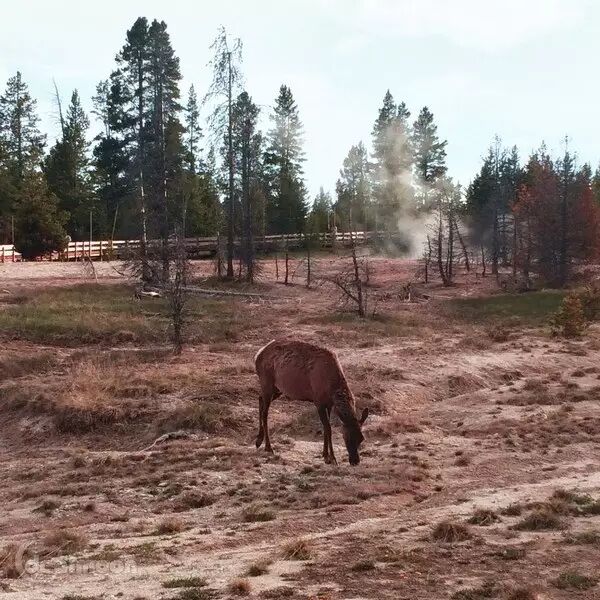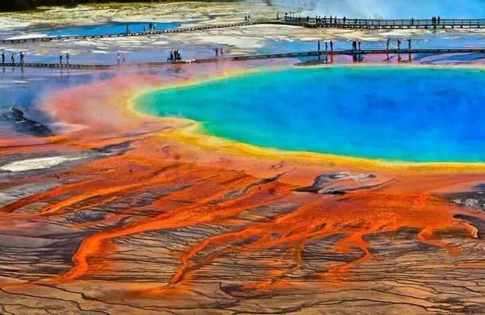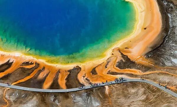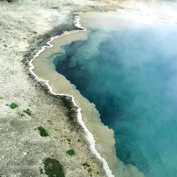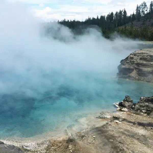 然后我们去了老忠实喷泉。导游会告知下一次爆发的时间,提前15min左右去周围等候就可以啦,不得不佩服喷泉名字的由来,因为它喷发得实在太准时啦!最后我们来到了赫赫有名的大棱镜温泉。大棱镜温泉最佳的观察角度是航拍角度,所以我们只能在边上行走,由于雾气,我们不能一睹它的全貌,不影响我们感受它的美~