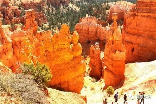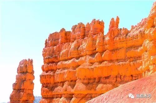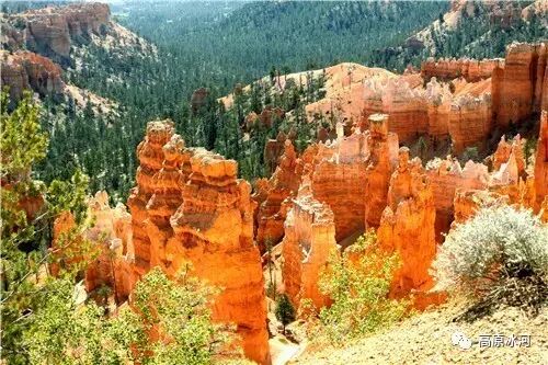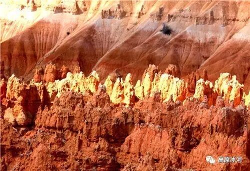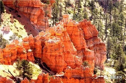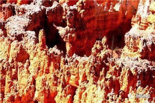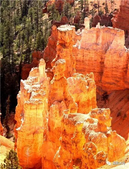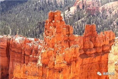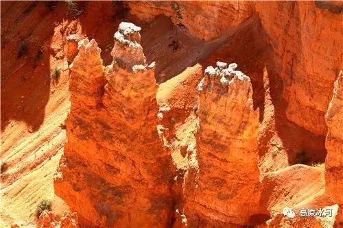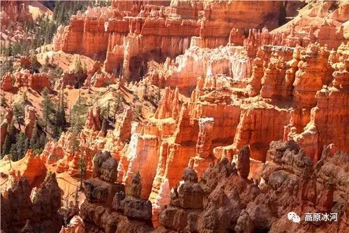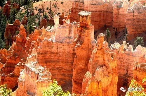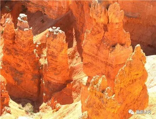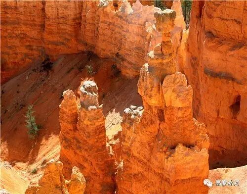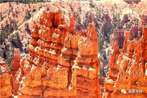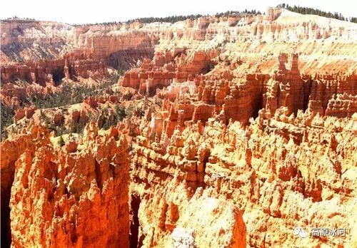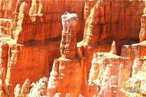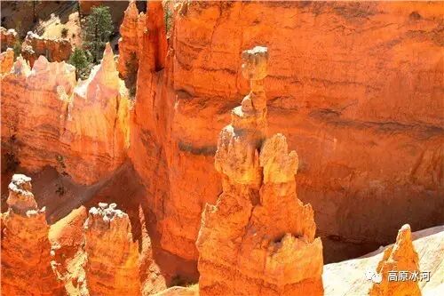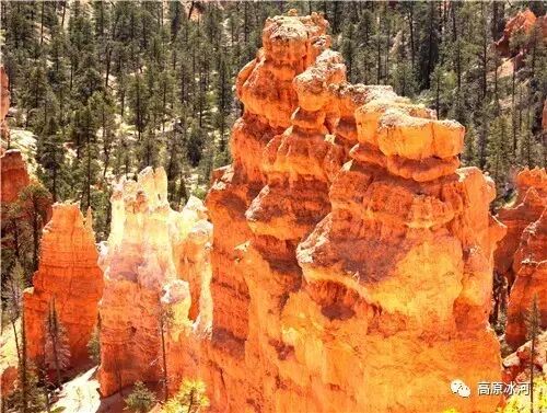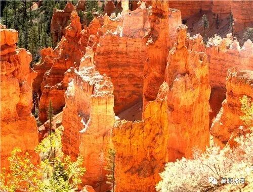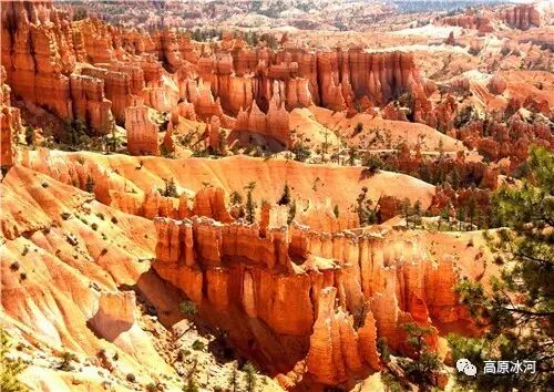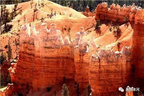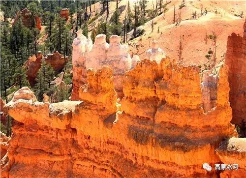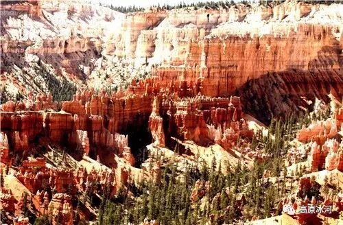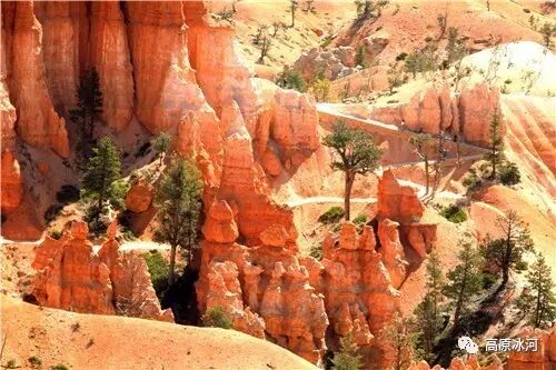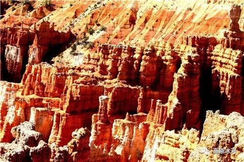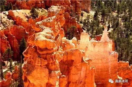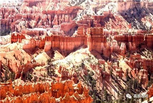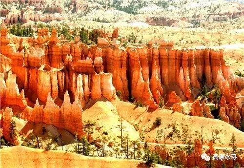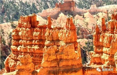 布莱斯峡谷位于美国西部犹他州,其实它不是峡谷,其独特的地理结构,由于长年风吹日晒、河水冲刷湖床沉积岩而形成布莱斯红、橙、白色60多米高恰似石柱、石墙、石俑的独特地貌,