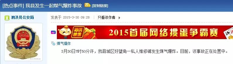 今日早上7点50分,泗洪县城区好望角一私人维修铺发生煤气爆炸,据现场了解,事故已造成人员受伤,具体事故产生的原因有关部门正在进一步调查中。