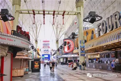 拉斯维加斯老城区的弗蒙街从来都是游客们的必经之处,两旁林立霓虹璀璨的酒店、极具拉 斯维加斯特色的纪念品商店,处处可见创意大胆的街头艺人,现已改造成占地175700平方 英尺的步行游览区。