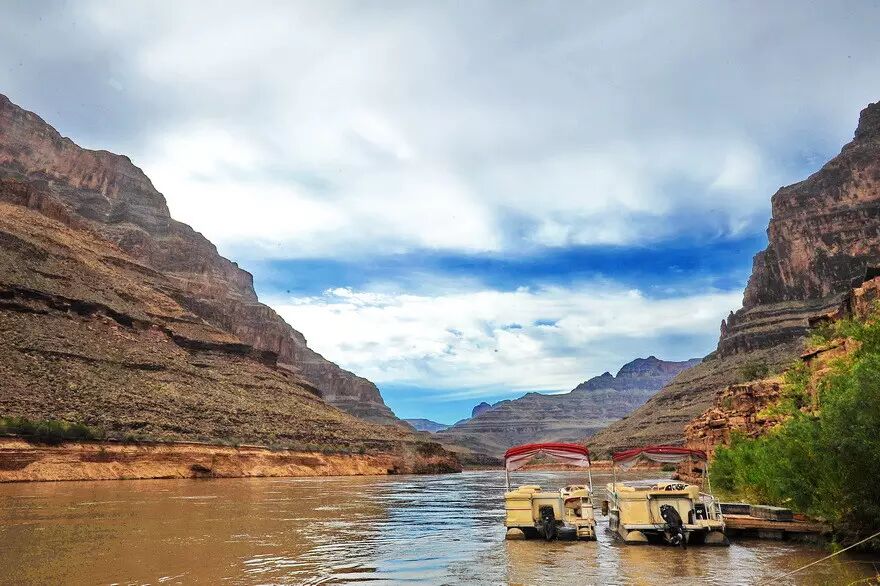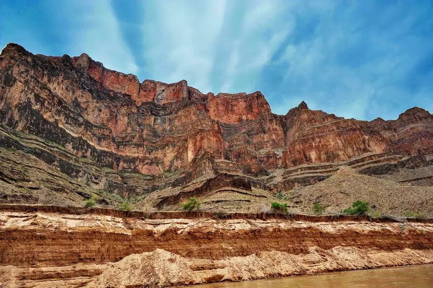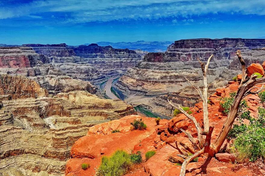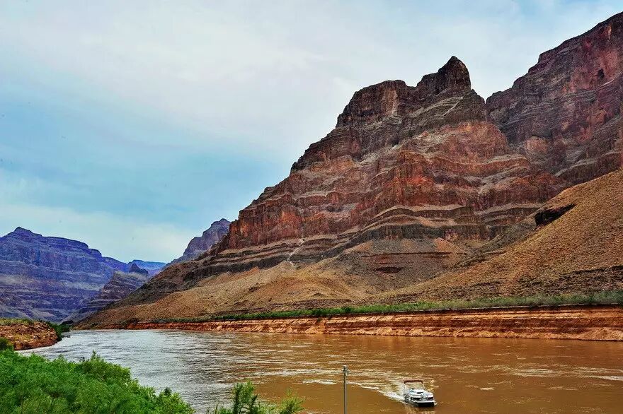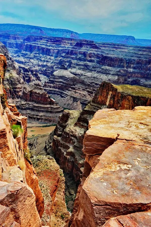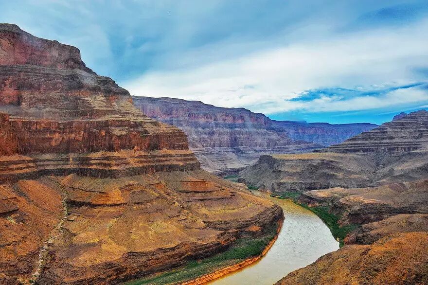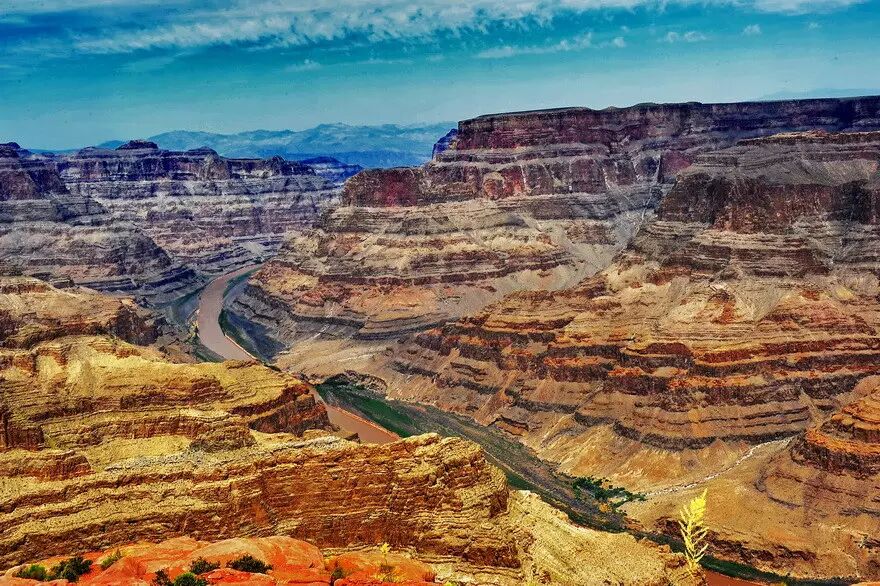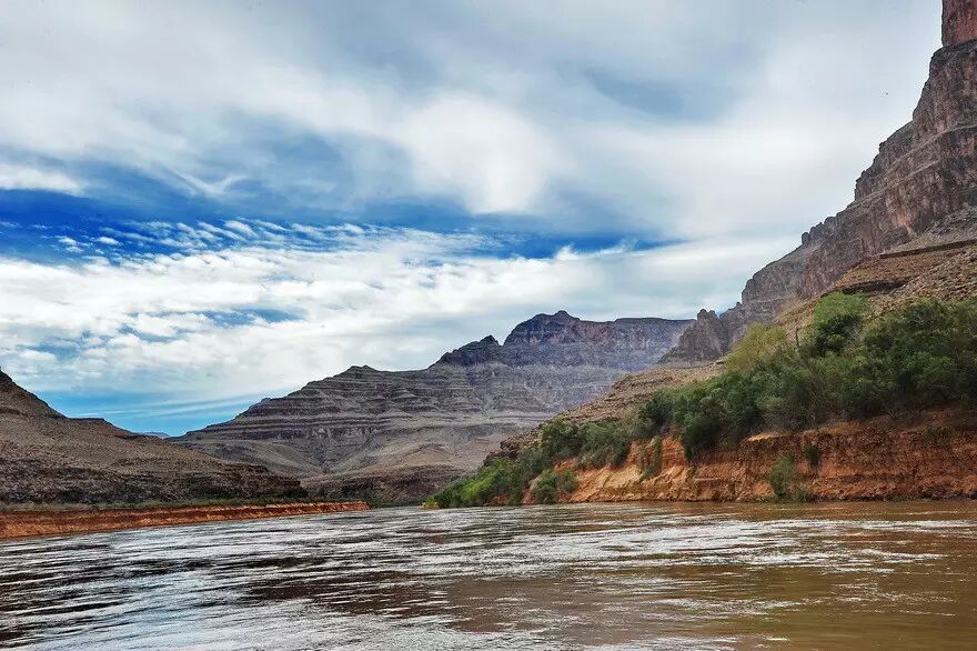 科罗拉多大峡谷。它全长446公里,是世界上最长的峡谷之一。峡谷顶宽6至28公里,最深处1800米。谷底水面不足 1000米宽