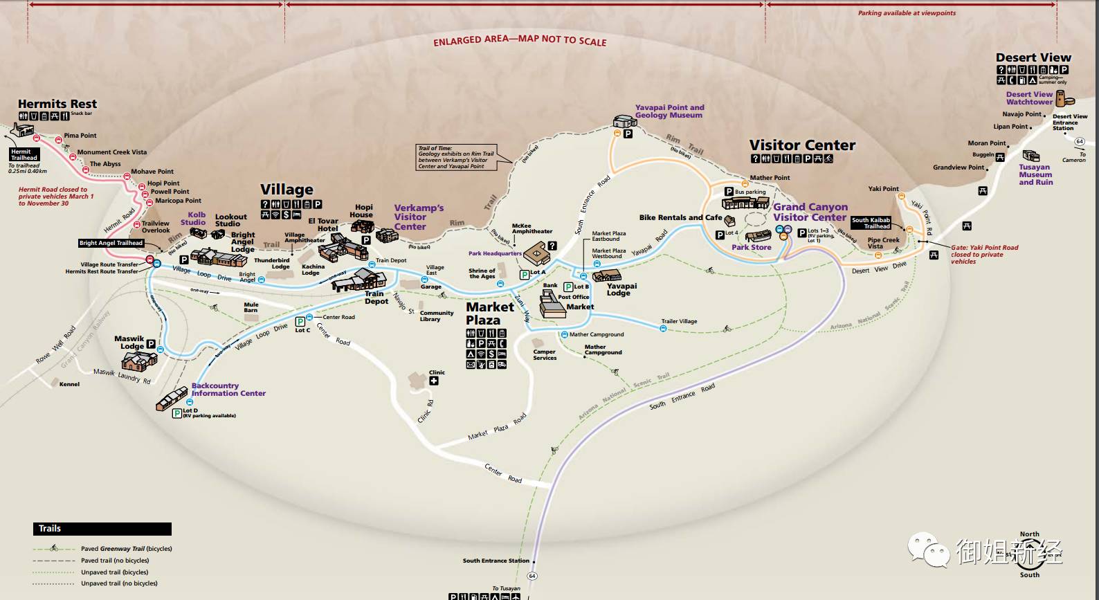 红色RED线(归隐路线Hermits Rest):这条线距离南门较远,其中Pima Point是全南缘最适合看日落的观景点之一。适合放在最后前往。可惜我还没到西边就已经日落了。