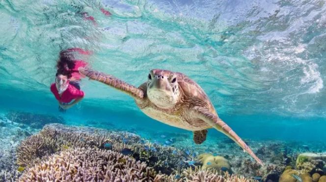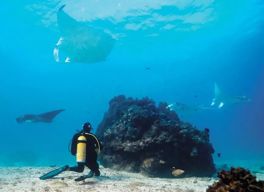 大堡礁从北至南长达两千多公里,每一寸海底都绚烂神秘,而大堡礁南部是全球最适合观赏蝠鲼等大型海洋动物的热点之一,是重要的海龟产卵地,也是巨大“魔鬼鱼”蝠鲼的家园。