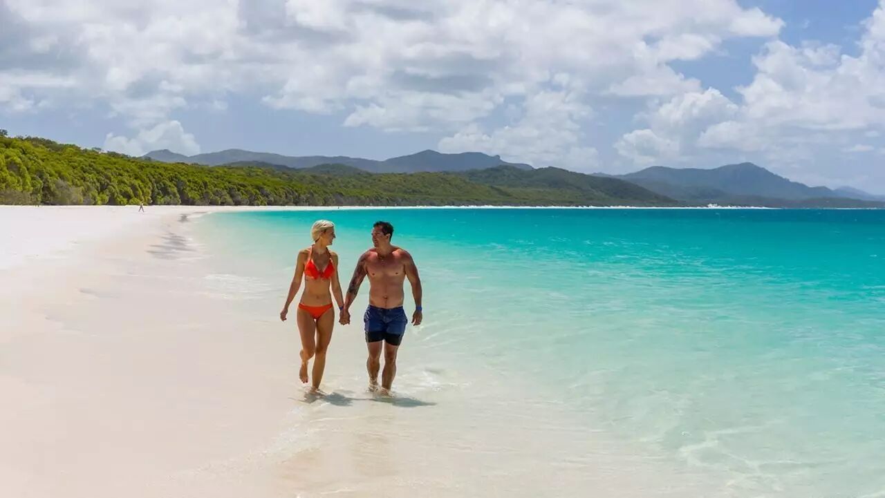 白天堂沙滩位于圣灵岛的东侧,被誉为“澳洲最美的沙滩”和“全世界最环保和最干净的沙滩”。整个沙滩绵延 7 公里,全部呈白色,由沙质洁白、细腻、柔软的纯二氧化硅细沙组成。