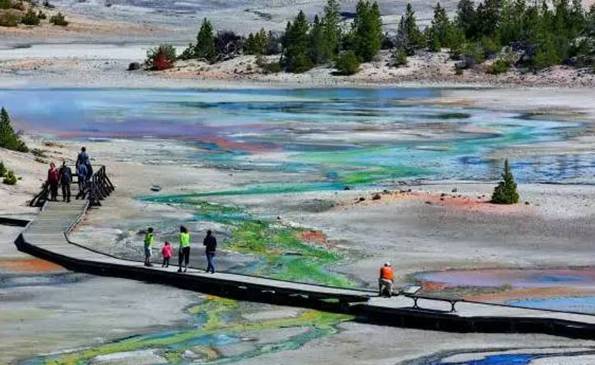 1. 七彩调色盘温泉盆地:这里烟雾缭绕,如梦如幻,密集分布的喷气泉孔营造出如天国梦境般的非凡气势,同时它也是黄石地热最集中的区域,黄石温泉内独一无二的嗜热微生物菌类形成五颜六色的温泉展示大自然的奥妙。