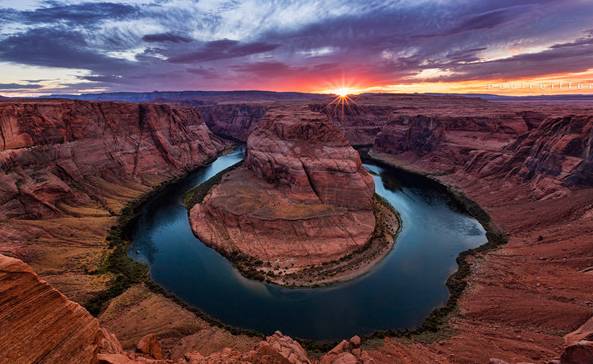 马蹄湾:科罗拉多河床上密布的水草使得河水在阳光下呈现出荧光般的幽绿,河流于此在红褐色的峡谷内急转360度,切割出一个马蹄状的峡谷。站在峭壁边,沉醉于碧水蓝天红岩钩画出的惊心动魄之美。