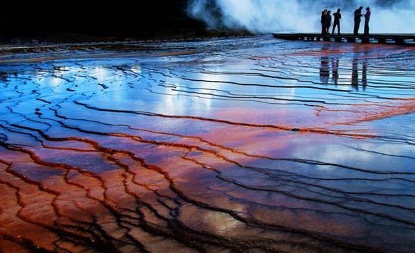 4. 大棱镜温泉:全球第三大热泉,又名地球之眼。置身温泉区,周围绿水蓝波,五彩滩涂,再配以黑岩绿林,蓝天白云,恍如仙境一般,大棱镜被誉为黄石最著名的温泉。
