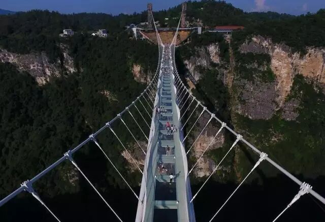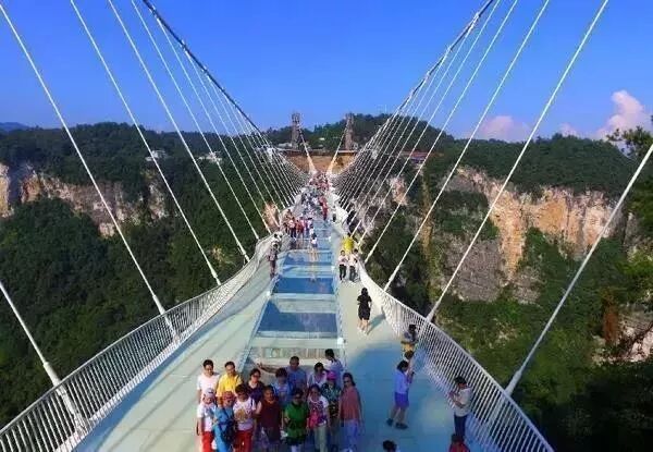 云天渡玻璃桥,世界最长、最高的全透明玻璃桥,玻璃桥建成后,为世界首座斜拉式高山峡谷玻璃桥;并创下世界最高最长玻璃桥、首次使用新型复合材料建造桥梁等多项世界之最。玻璃桥总长430米、宽6米,桥面距谷底约300米,可站800人。桥面全部采用透明玻璃铺设,桥中心有全球最高的蹦极台,整个工程无钢筋支架,是一种全玻璃结构的桥梁。