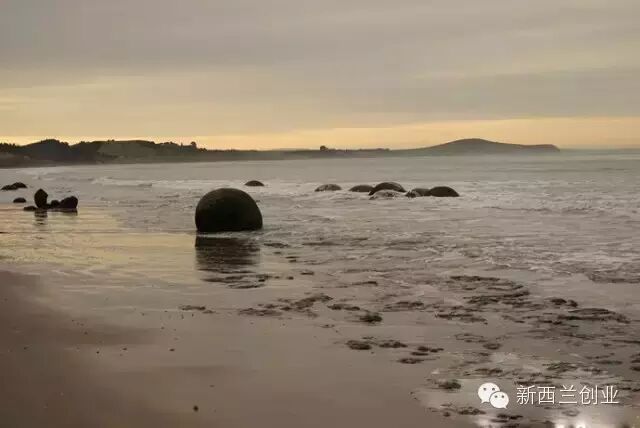 越往东走,雪山就离我们远去了。在东部小城Oamaru稍作休息后,继续赶路来到了海边上的摩拉基公园,要看摩拉基大圆石。这些大大小小的圆石,最大的直径有2.2米,最小的也有30厘米。据说6500万年前,含有结晶和碳酸盐的海底泥石,经过400万年的沉积,再在1500万年前经地壳的变化升出海面。