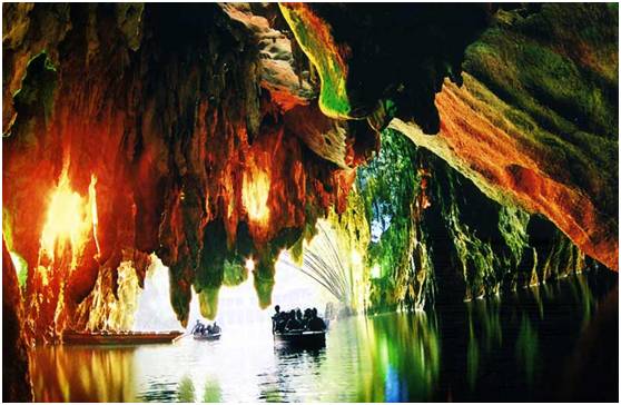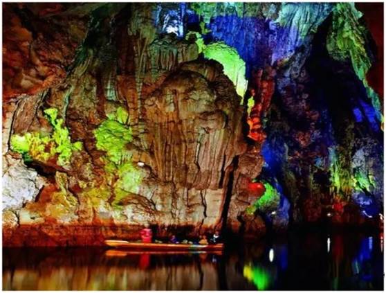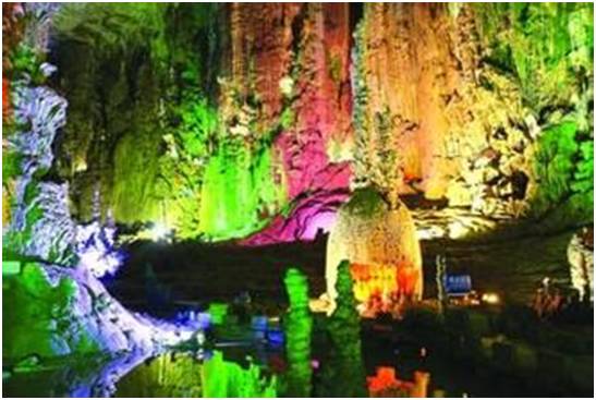 这是“中国十大奇洞”之首,石笋、石柱、石幔、石花、银雨树、卷曲石,各种美妙的构造在彩灯的映射下,幽暗神秘,仿佛是地底下一个奇幻的梦境
