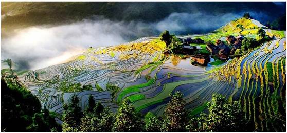 延绵数公里的梯田,轮线条可以与龙脊梯田并驾,论广阔可以与元阳梯田齐驱