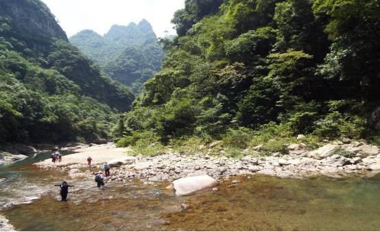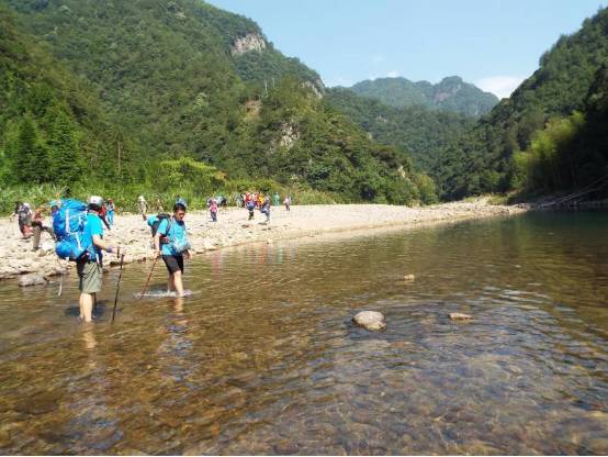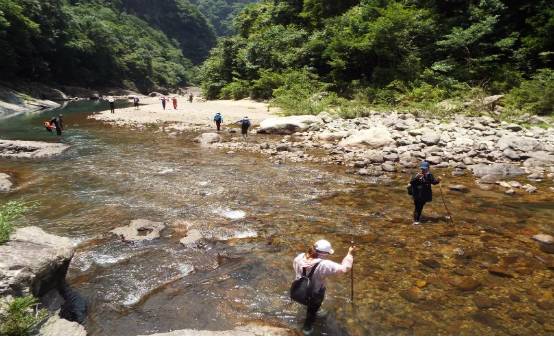 炉西峡河床沿途铺满了大大小小的石头,古怪离奇,大的石头像座房子,有的像蹲坐着的青蛙,有的似走动中的大象,还有的如引吭高歌的雄鸡,简直惟妙惟肖。小的石头圆滑干净,色彩斑斓,像鸭子在水中嬉戏,像鱼儿在水里玩耍,更像飘飞的小鸟啄食。我就像一个淘气的孩子一会儿奔走在山间小道,一会儿涉足在溪涧水中,用手中的相机抓拍下驴友们各具神态的精彩瞬间。来到这里,呼吸清新的空气还有那鸟语花香把我们带到了人间仙境,我忍俊不禁大声呼喊: “炉西峡,我们来了……”